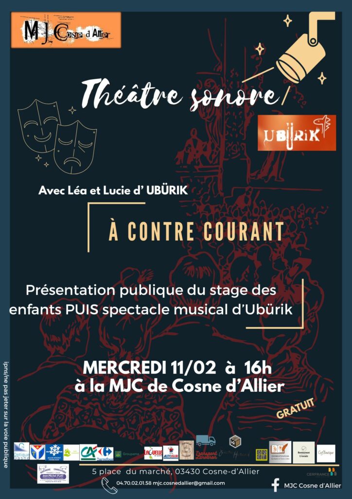 Le stage de théâtre jeunesse prévu en décembre a été reporté au début des vacances de février, en partenariat avec l'ALSH de Cosne d'Allier. Il se déroulera du lundi 9 au mercredi 11 février à la MJC et donnera lieu à une restitution du travail ouverte au public mercredi 11 février. Inscription auprès du centre de loisirs.